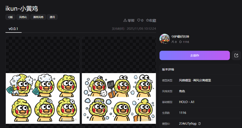 😃 不过,杰哥想更加 "原汁原味 ",Holopix AI** **是支持 "模型定制 " 的,还记得上节 "坤坤自走棋 ",我们用网上搜罗到的 "ikun小黄鸡 " 图片作为素材,训练了一个专用用来生成小黄鸡的 "ikun" 模型吗?
