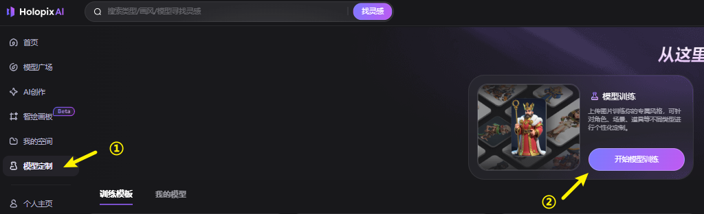 打开 Holopix AI 官网,点击左侧 "模型定制 " → "开始模型训练":