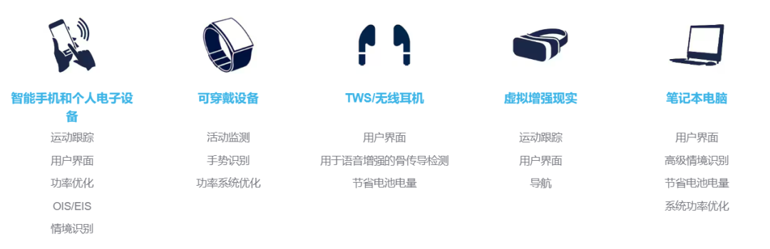 该智能器件支持利用AI算法进行边缘处理、低功耗传感器融合 及动态自配置,在TWS耳机、标准或运动耳塞等可听戴设备、助听器、AR/VR耳机和智能眼镜等应用中可大大提升电池自主性。