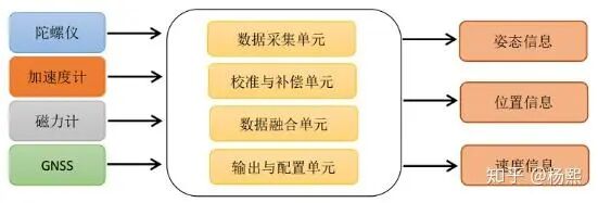 AHRS 航姿参考系统(Attitude and Heading Reference System)AHRS系统是在VRU的基础上增加了磁力计或光流传感器,用卡尔曼或者互补滤波等算法为用户提供拥有绝对参考的俯仰角、横滚角以及航向角的设备,这类系统用来为飞行器提供准确可靠的姿态与航行信息。我们通常所说的9轴姿态传感器就属于这类系统,因为航向角有地磁场的参考,所以不会漂移。但地磁场很微弱,经常受到周围带磁物体的干扰,所以如何在高机动情况下抵抗各种磁干扰成为AHRS研究的热门。
