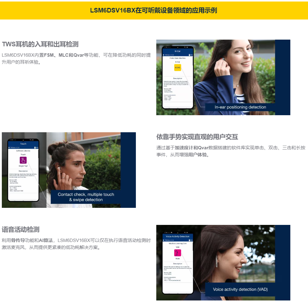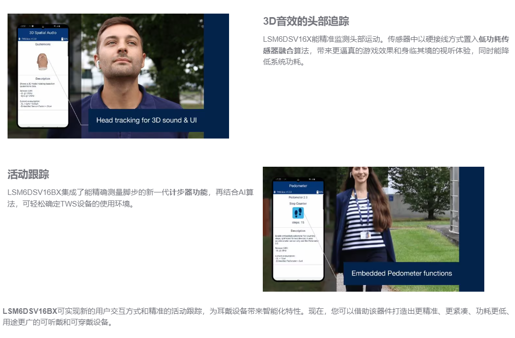 独特的超集成LSM6DSV16BX IMU将人类感官与环境结合,实现卓越的聆听体验。该器件功能十分丰富,可用作6轴IMU来实现头部跟踪和活动检测,可用作音频加速度计来实现骨传导,可用作触摸传感器来支持用户交互(触摸、长按和滑动操作),在具有Qvar功能时,还可用作入耳检测传感器。它能代替四种传感器,更容易打造出别致小巧的设计,并提供更多的空间来容纳大尺寸电池。
