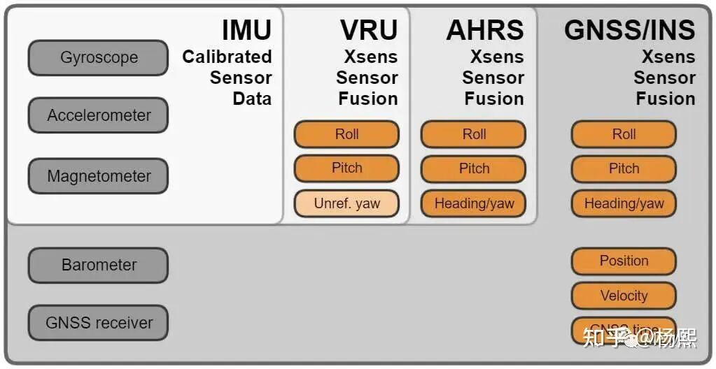 VRU 垂直参考单元(Vertical Reference Unit)是在IMU的基础上,以重力向量作为参考,用卡尔曼或者互补滤波等算法为用户提供有重力向量参考的俯仰角、横滚角 以及无参考标准的航向角。通常所说的6轴姿态模块就属于这类系统。航向角没有参考,不管模块朝向哪里,启动后航向角都为0°(或一个设定的常数)。随着模块工作时间增加,航向角会缓慢累计误差。俯仰角,横滚角由于有重力向量参考,低机动运动情况下,长时间不会有累积误差。