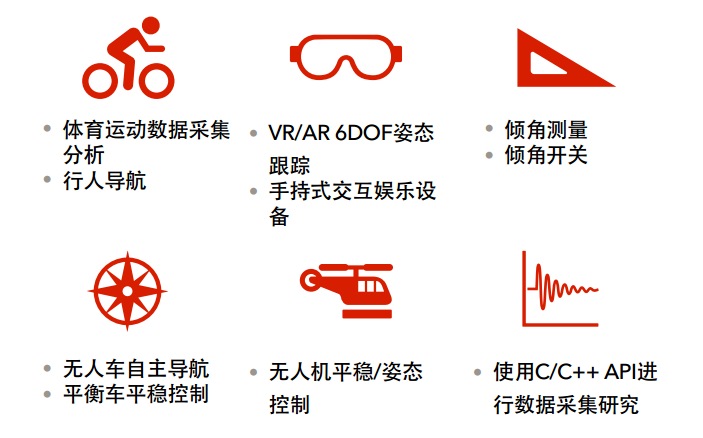 应用场景主要在体育运动数据采集分析、行人导航、VR/AR 6DOF姿态跟踪、手持式交互娱乐设备、倾角测量、倾角开关、无人车自主导航、平衡车平稳控制、无人机平稳/姿态控制、使用C/C++API进行数据采集研究等方面。