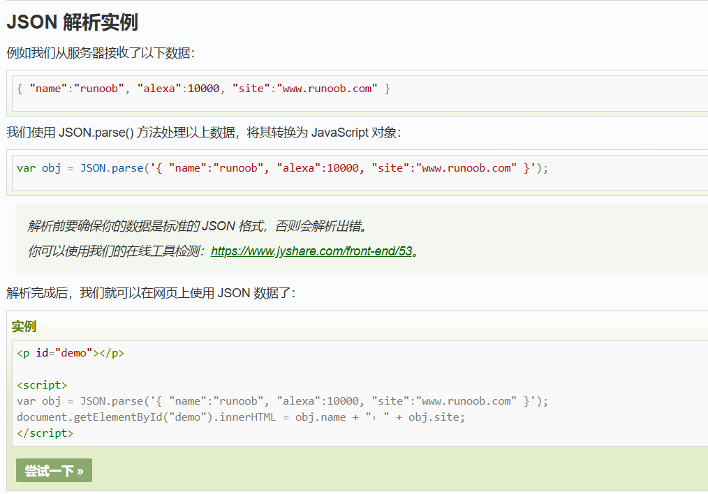 var obj = JSON.parse('{"name":"runoob", "alexa":"10000", "site":"www.runoob.com"}');