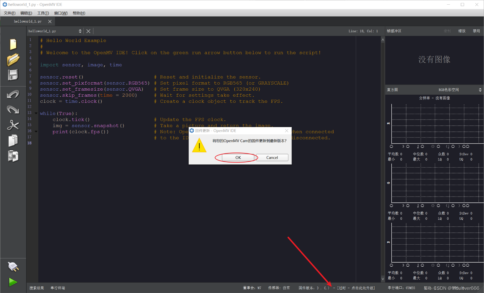 IDE连接OpenMV之后,点击下放版本处,IDE会检测固件版本,并提示是否升级: