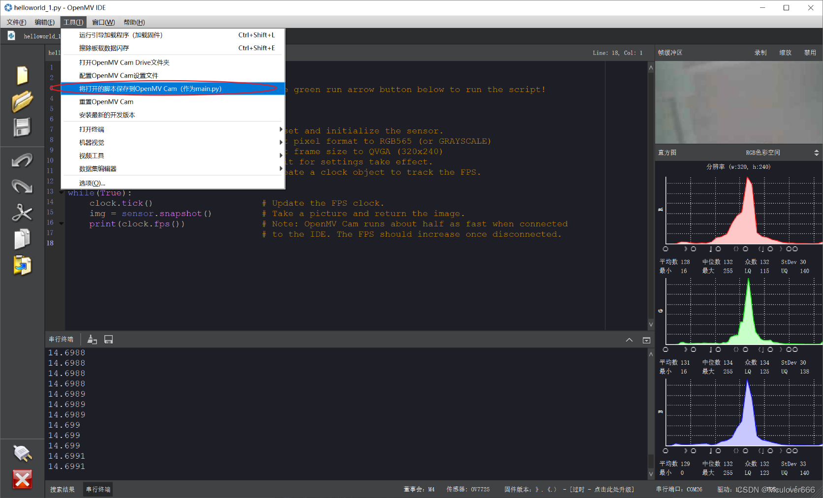 在IDE中直接保存当前打开的脚本到OpenMV中。