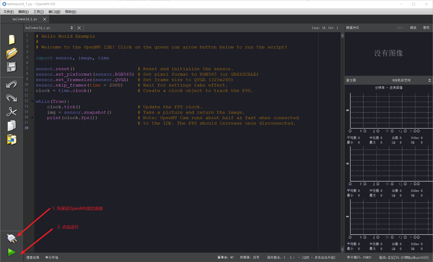 通过IDE连接OpenMV:点击此按钮连接,IDE会自动寻找OpenMV的串口进行连接。