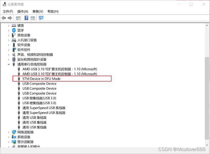 按下复位键,让STM32进入DFU下载模式,PC会检测到STM32 DFU设备: