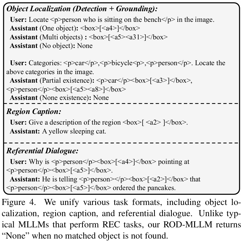 使用 LLM 统一指代、定位和检测。我们采用 LLM Vicuna 7B[9] 对低层次定位结果进行高层次理解。如图2顶部所示,对于给定的文本表达式,LLM 利用其强大的语言理解能力,判断每个区域是否符合要求并提供最终输出。同样地,当提供一个区域锚点标记时,LLM 可以解释相关的图像内容,从而实现区域描述和指代对话等任务。如图4所示,我们的框架统一了多种任务形式,如指代、定位和检测。其中,标签 <p> 和 </p> 用于包裹表达式。<box>[]</box> 中的每个锚点标记用于引用具有坐标的特定区域。特别是,当图像中没有符合要求的对象时,LLM 将输出 "None"。