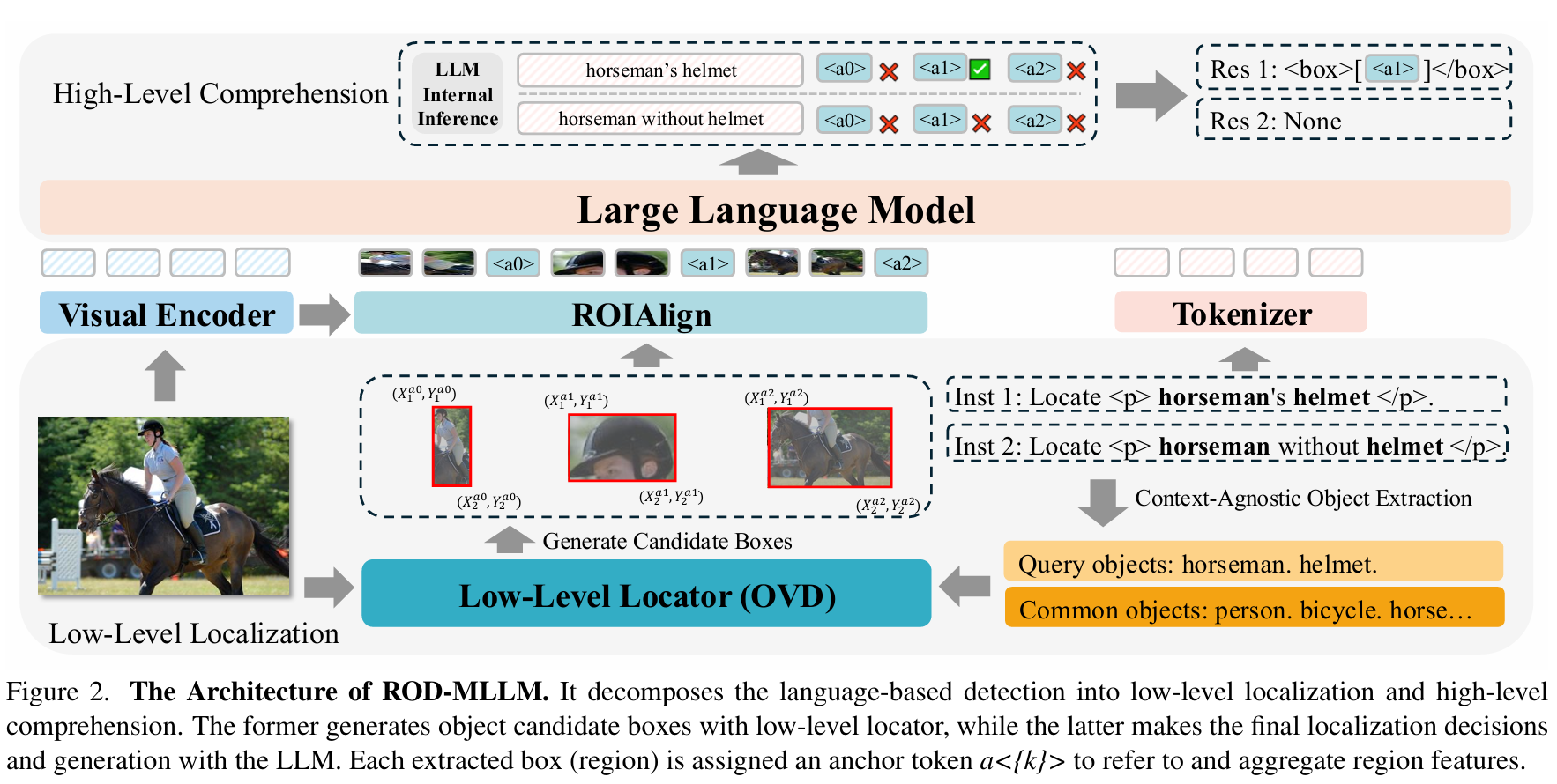 在本节中,我们介绍 ROD-MLLM 的架构,如图2所示。它由两部分组成:低层次定位和高层次理解,将在第3.1节和第3.2节中分别解释。