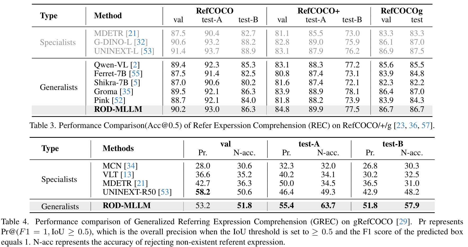REC。与基于语言的目标检测相比,REC 专注于定位单个指代对象。我们在 RefCOCO/+g 数据集[23, 36, 57]上进行评估。值得注意的是,由于输出对象数量的不同,REC 与检测任务存在冲突[61]。为了缓解这一点,我们在指令中添加了"用区域回答"。如表3所示,ROD-MLLM 优于大多数其他 MLLMs,表明它在提高检测性能的同时保持了出色的 REC 能力。