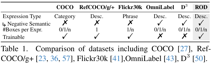 最终,我们分别从检测和定位数据集中获得了20万和30万对描述-图像对,并将这个更可靠的对象检测数据集命名为 ROD。如表1所示,与其他数据集相比,ROD 具有丰富的表达类型和多样化的边界框数量。