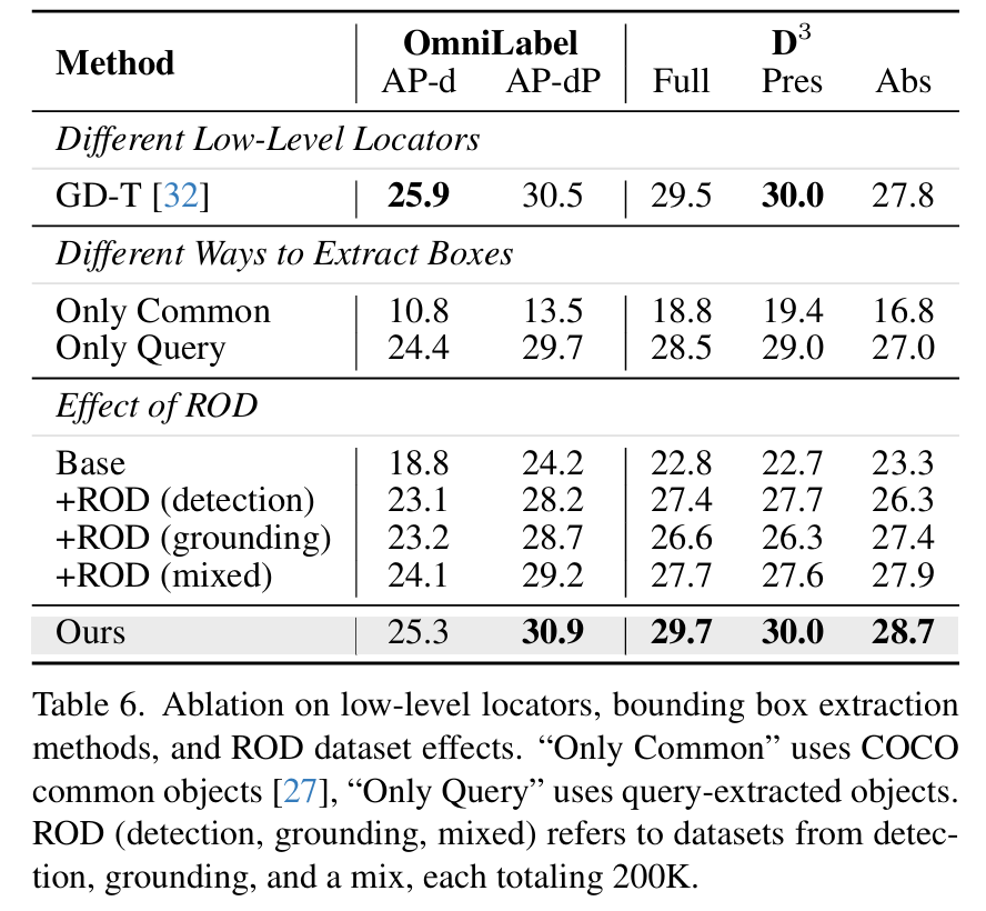 不同的低层次检测器。如表6的第一部分所示,将 OWLv2[38] 替换为 Grounding DINO-T[32] 作为低层次定位器表明,最终指标的波动不超过1个百分点。这验证了 ROD-MLLM 不依赖于特定的 OVD。低层次定位器仅作为候选框提取器,内容理解由 LLM 处理。