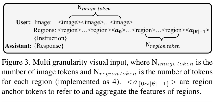多粒度视觉输入。给定一张图像 III,它被视觉编码器 fVf_VfV 编码以获得多层特征 EI1∼LE^{1\sim L}_IEI1∼L,其中 LLL 是视觉编码器的层数。我们在 EIL−1E^{L-1}_IEIL−1 上使用一个两层 MLP 投影器来获得语言空间中的全局图像嵌入 EIgE^g_IEIg。对于由基于查询的定位器获得的候选框集 BBB,我们从多层特征中构建一个三层特征金字塔 EI12,18,L−1E^{12,18,L-1}_IEI12,18,L−1 并取平均值以提取区域特征。然后,我们使用 8×88\times88×8 ROI Align[18] 根据边界框坐标提取区域视觉特征 ER∈RB×8×8E_R \in \mathbb{R}^{ B \times8\times8}ER∈RB×8×8。与之前的方法[35, 62, 63]通过下采样或平均池化将一个区域特征嵌入到单个文本标记中的做法不同,我们将一个区域划分为 2×22\times22×2 的块,并将每个块通过一个 MLP 层以获得一个文本标记。使用更多的标记来编码一个区域,使得 LLM 能够拥有更细粒度的局部信息。如图3所示,LLM 有两种粒度的视觉输入:全局和区域特征标记。在每个区域的标记之后,我们使用一个区域锚点标记 <a_i> 来聚合区域信息并用于区域引用。
