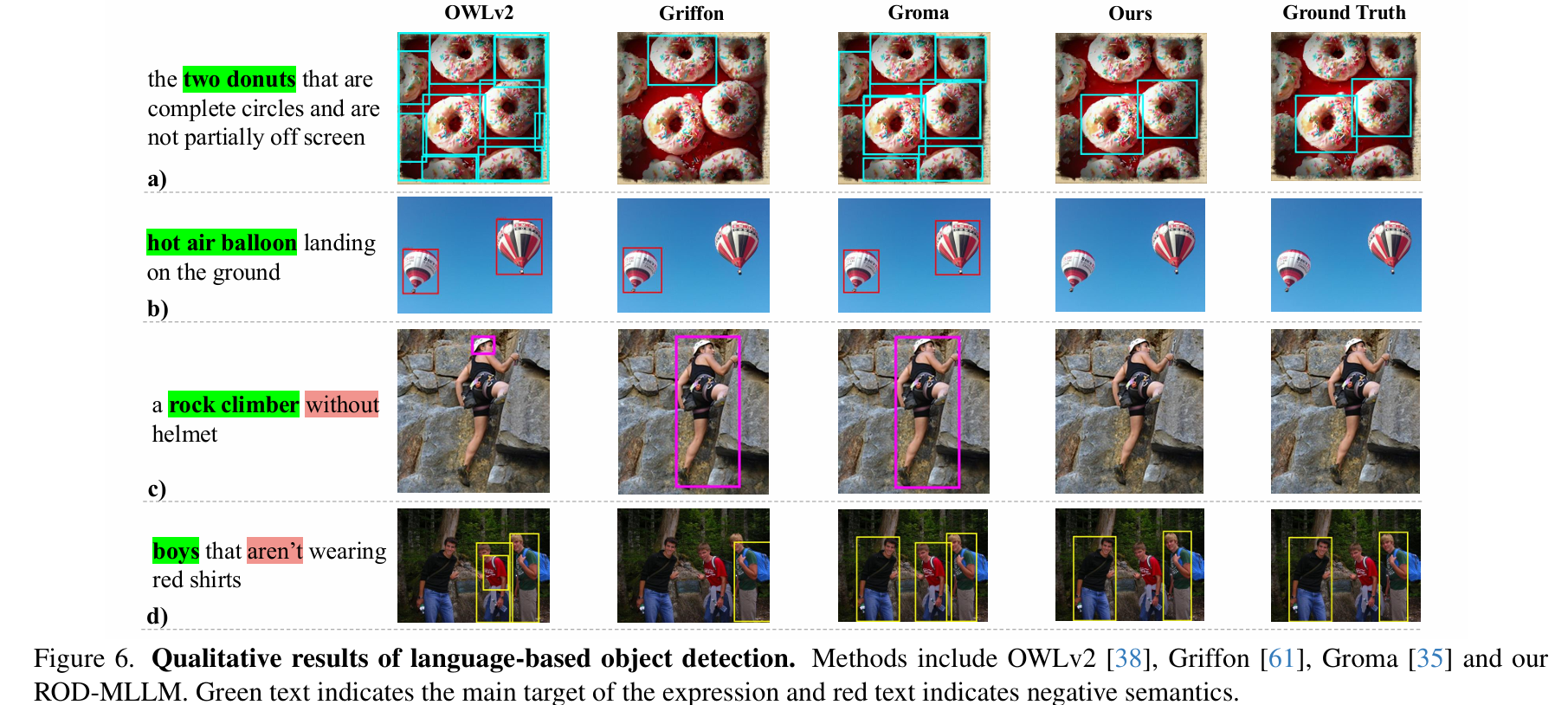 我们在图6中展示了定性结果。像 Griffon[61] 和 Groma[35] 这样的 MLLMs 总是检测一个或所有对象,而不考虑具体的语义。我们使用的低层次定位器 OWLv2[38] 在准确解释描述方面也存在困难,因为它只适用于类别短语定位。在图6 b) 中,我们的模型正确识别出热气球并未着陆,因此检测结果为 None。在案例 d) 中,涉及复杂的否定语义,我们的模型成功地在三人中过滤出了目标。这些例子表明,我们的方法相比现有方法具有更优越的理解和定位能力。