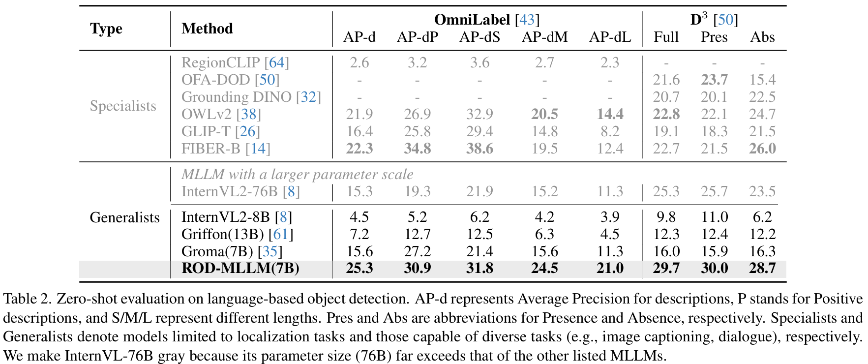 评估结果。如表2所示,我们的方法显著优于现有的 MLLMs。具体来说,在 OmniLabel 数据集上,我们在自由形式对象描述检测(AP-d)方面比所有类似规模的 MLLMs 取得了显著的提升(+9.7 AP)。我们的模型使用 OWLv2[38] 作为低层次定位器,但实现了更高的 AP(21.9 到 25.3),证明了 LLM 中高层次理解的有效性。值得注意的是,尽管 FIBER-B[14] 在更大的对象检测数据集上进行了训练,并且在 AP-dS 和 AP-dP 上表现更好,但在涉及否定描述(AP-d)和长文本(AP-dM 和 AP-dL)的指标上,其表现远不如我们的 ROD-MLLM。这突显了 ROD-MLLM 在理解更复杂对象描述方面的优势。