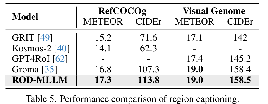 区域描述要求模型描述指令中提供的坐标框内的内容,例如"描述区域 [<a_k>] 的内容"。我们在 RefCOCOg[36] 和 Visual Genome[24] 上进行评估,如表5所示,在 RefCOCOg 上将 CIDEr 提高了6.5分,超过了 SOTA,并在 Visual Genome 上取得了相当的性能,证明了 ROD-MLLM 强大的引用理解能力和区域锚点标记的有效性。