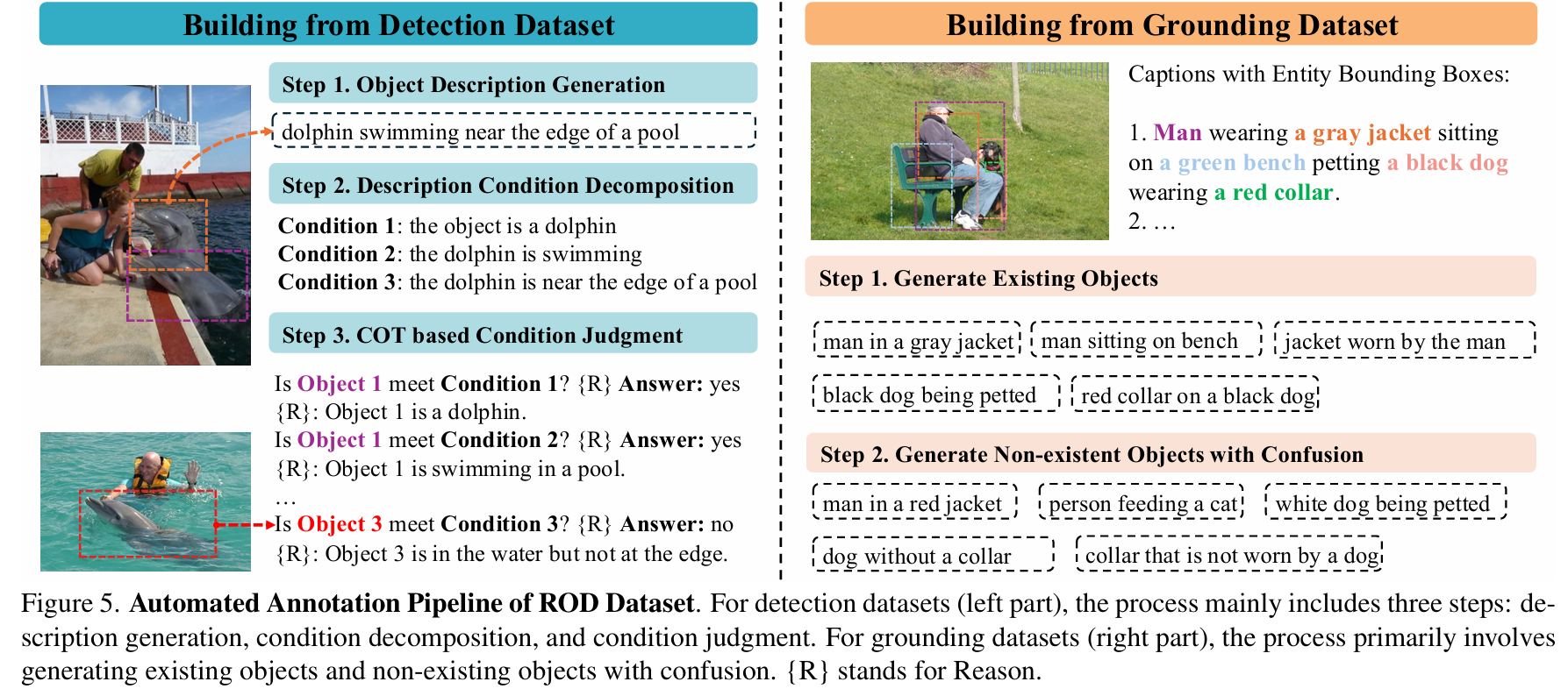 此外,为了实现模型对自由形式描述的检测能力,我们设计了一个自动化的标注流水线来构建一个基于语言的目标检测数据集 ROD,以解决该领域训练集的缺乏问题。与通用检测任务不同,基于语言的目标检测因其完全开放集的语言描述而特别具有挑战性。基于现有的检测[44]和定位[41]数据集,我们使用 MLLMs 生成丰富的目标描述,并提出了一种基于思维链(COT)的条件判断方法,将描述与目标边界框进行匹配,从而实现基于描述的零到多目标定位。
