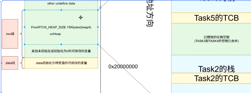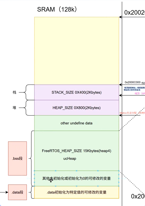 用途:动态内存分配(如malloc()、free()),FreeRTOS 的任务栈、队列等也基于堆分配。
