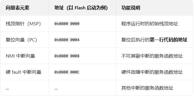 上文说过,中断向量表是一个地址列表,存储了复位向量、所有中断服务函数的入口地址。它位于启动介质的起始地址区域(如 Flash 的0x0800 0000处)。
