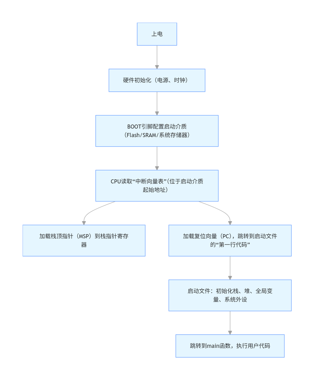 上电 / 复位→CPU 读取 BOOT 引脚电平→确定自举区映射目标。