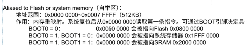 | 自举区(重映射区) | 0x0000 0000~0x0007 FFFF | 512KB,复位后默认读取第一条指令的地址,本身不存代码,仅用于地址重映射。 |