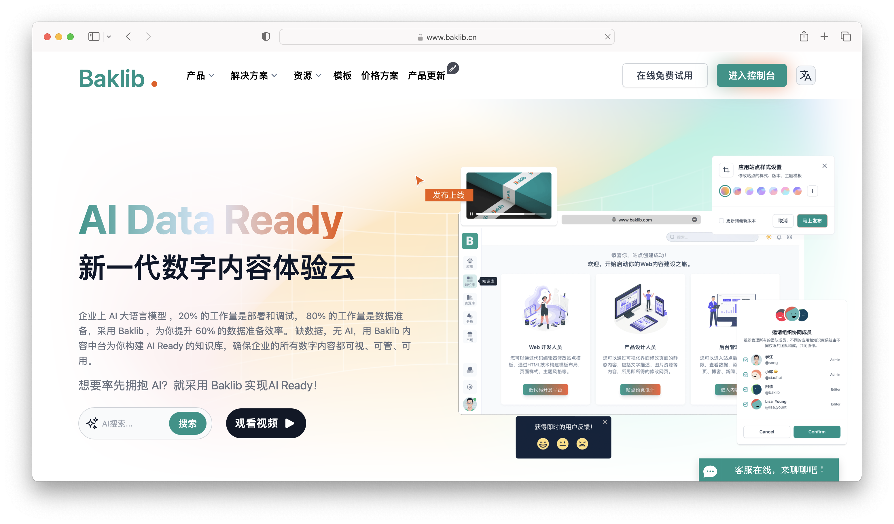 新一代数字内容体验云,Baklib 是一款 All in Content 的企业级云平台,助力企业一站式管理数字内容和一体化构建多场景数字体验。