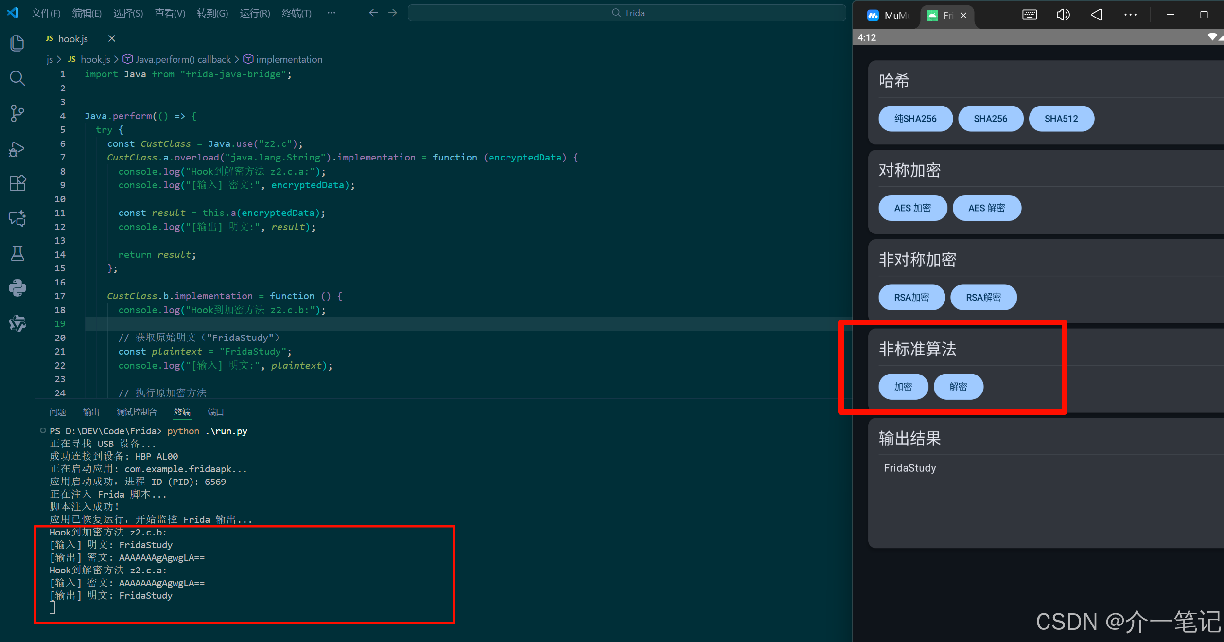 encrypt(String, String)); - 编写Hook脚本,打印方法的输入参数(明文/密文、密钥)和返回值;