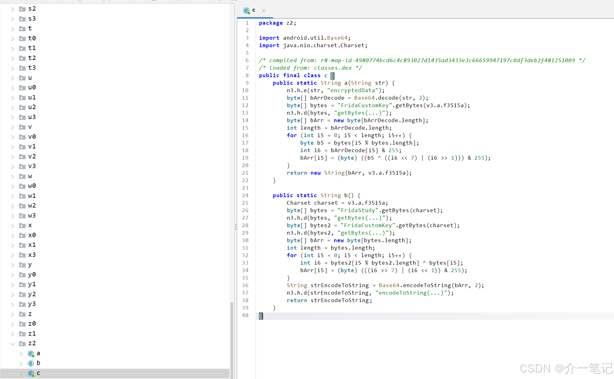 android.util.Base64.decode后紧跟z2.c.a并且带了r8-map-id-xxx:说明z2.c.a方法可能在调用Base64解码后进行解密处理,并且经过了R8代码混淆,因此z2.c.a是疑似解密方法。