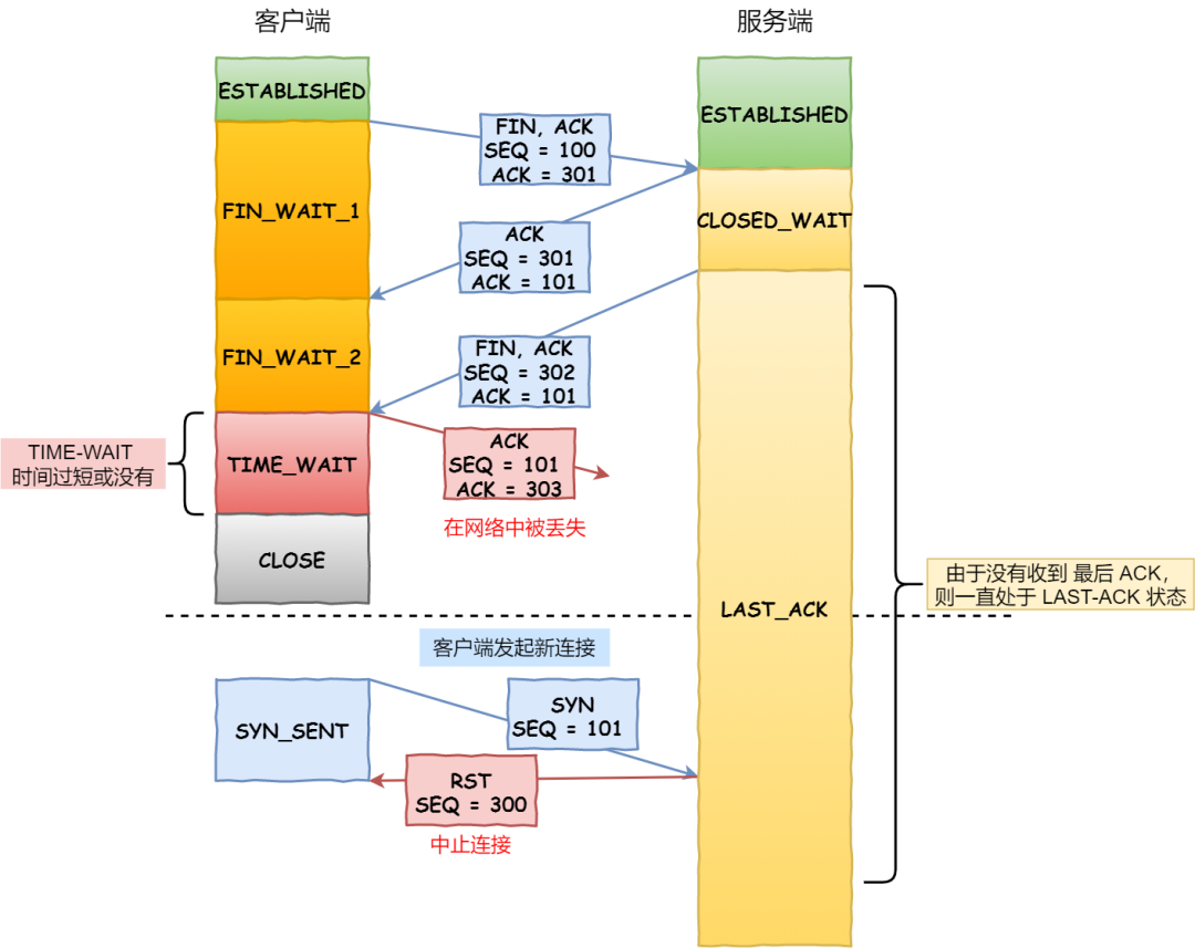 ACK报文如果在网络中被丢失了,此时如果客户端TIME-WAIT过短或没有,则就直接进入了CLOSE状态了,那么服务端则会一直处在LASE-ACK状态。 - 当客户端发起建立连接的