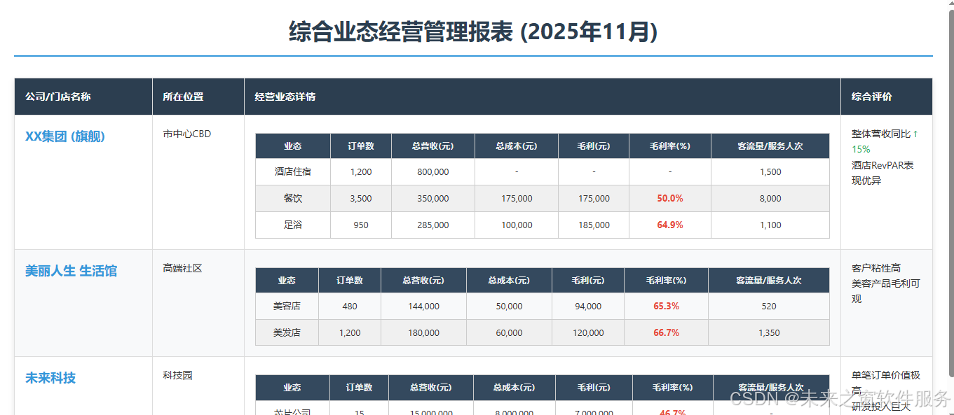 - 全景洞察,一览众山小:这张报表就像仙盟中的千里神目术,能让仙盟的管理者们对各业态的经营状况进行全面俯瞰。无论是大型仙门旗下的酒店、餐饮、足浴等多种业务,还是小商号专注的美容、美发等领域,报表都能清晰呈现其订单数、营收、成本、毛利及客流量等关键信息。以 "XX 集团 (旗舰)" 为例,管理者一眼便能知晓旗下酒店住宿、餐饮、足浴等业态的经营详情,如同站在仙山之巅,对盟内各处的经营动态了如指掌,从而为制定整体发展策略提供全面依据。