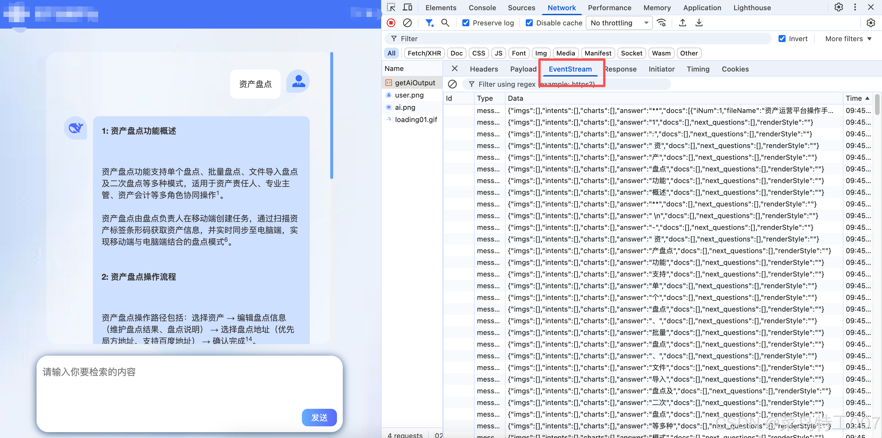 大家可以看到这个响应结果是EventStream,前端要做的就是把响应结果逐字的拼接,然后响应。(因为前端技术不同,写法也不同,这里不做展示)。