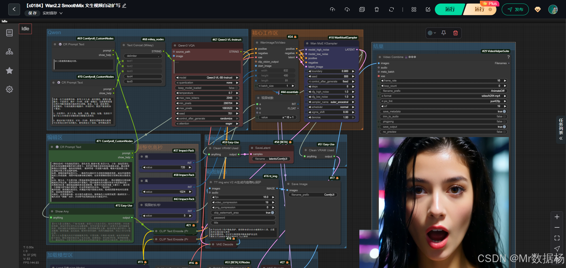 整个工作流通过多类节点分工协作,包括图像载入、文本扩写、模型加载、参数计算、潜空间采样、图像解码与视频导出。文本逻辑由三段 CR Prompt Text 和 TextConcat 负责整合,图像理解由 Qwen3-VL 完成,采样核心由 WanMoeKSampler 执行。ImpactInt 与 SimpleMath+ 自动化控制视频参数。最终的视频输出由 VHS VideoCombine 导出为 H264 MP4。