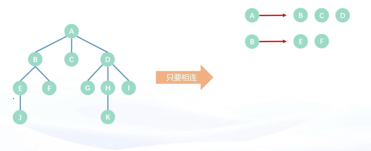 问题在于,对于无根树那种父子关系不明确的树,无法肯定 BCD 和 A 的关系,那我们索性就把 ABCD 全都存储下来,即把结点与其相连的结点全都存储下来