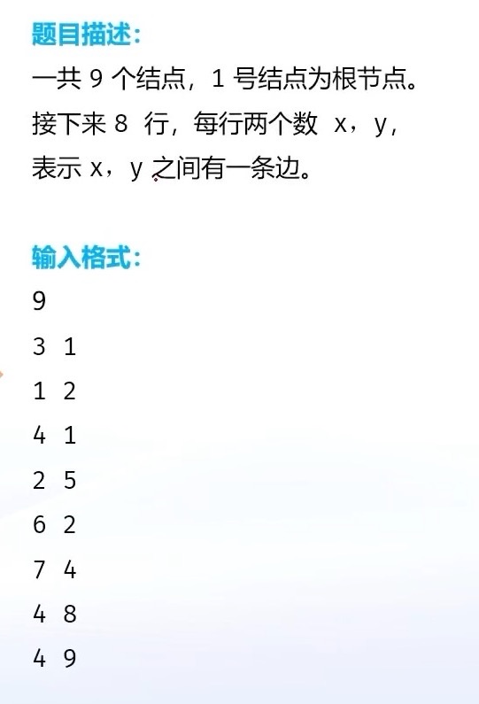 算法比赛中,一般给出的树结构都是用编号简化的,同时会提供下面两条信息: