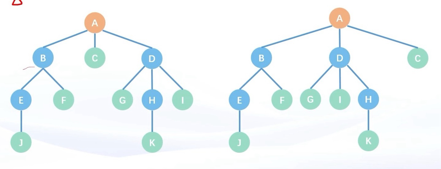 - 有根树(根节点明确)与无根树(根节点不明确,A、B、E任意一个结点都可以作为根节点)