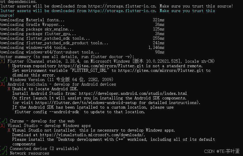 Android Studio 安装下载 , 安装的时候,遇到网络问题,安卓的 sdk 或则部件安装不完整,这时候需要添加国内的镜像地址,来重新安装。 **Name(名称)** : 可以填写 Tencent Mirror或 国内镜像 **URL(地址** ): 填写以下任一国内镜像的总地址(推荐腾讯云): **https://mirrors.cloud.tencent.com/android/repository/(腾讯云)** **https://mirrors.opencas.cn/android/repository/(中国科学院)**  镜像配置好了,尽管有感叹号,也点"应用"。 切换到 SDK Tools 安装这个。或则 flutter doctor 后,按照提示来 安装必要的。  安装后,执行下面命令,同意开发安卓协议 ```bash flutter doctor --android-licenses ``` ```bash flutter doctor ``` 这样就可以开发 app了。  验证: ##### 1. 创建一个新项目 flutter create my_first_app ##### 2. 进入项目目录 cd my_first_app ##### 3. 在设备或模拟器上运行它 flutter run ##### 成功运行起来