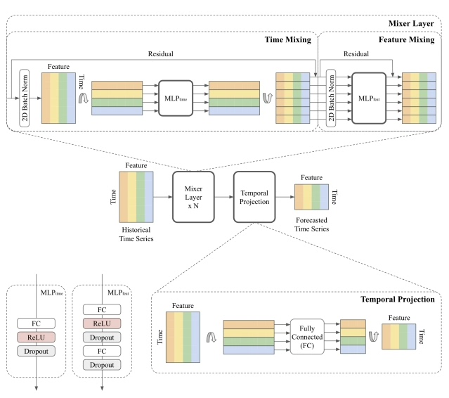 TSMixer 的整体架构全部由简单的多层感知机(MLP)组成。这种设计摒弃了一些复杂的神经网络结构,如卷积或者注意力机制等。MLP 的简单性使得模型不仅易于理解和实现,还在一定程度上降低了计算复杂度。