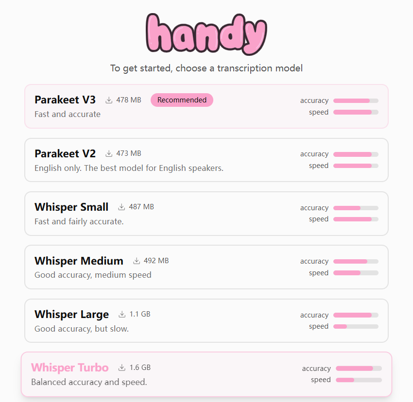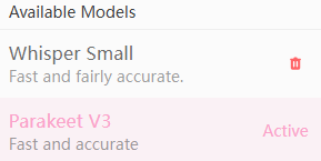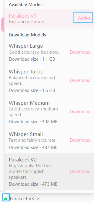 | Parakeet V3 | CPU优化,自动语言检测 | 英文更强 | 老电脑、低功耗设备 |
