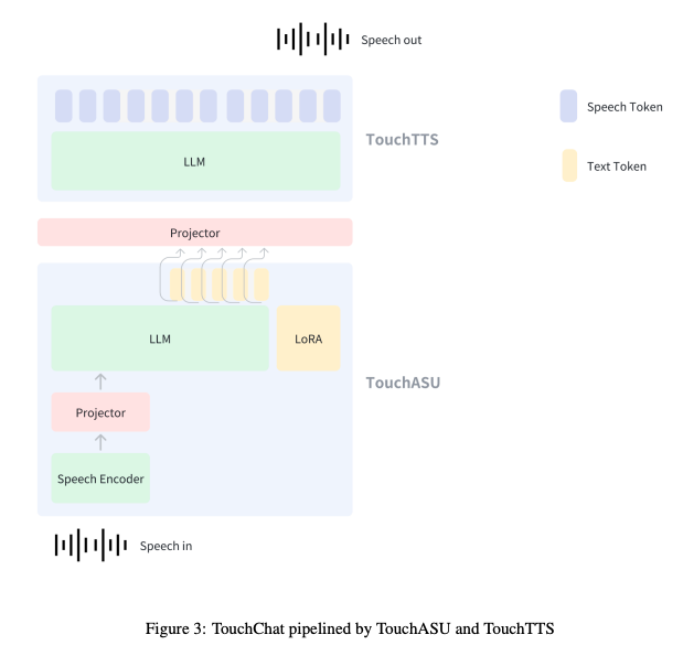 - TouchChat:参考Qwen2.5-omni设计,由TouchASU和TouchTTS组成,TouchASU负责理解语音,TouchTTS负责生成语音回复。