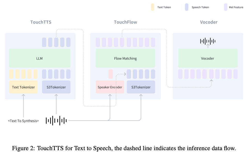- TouchTTS:由TouchTTS、TouchFlow、声码器三部分组成。TouchTTS负责文本到语音token建模,TouchFlow将语音token转化为梅尔谱特征,然后声码器将其转换为音频