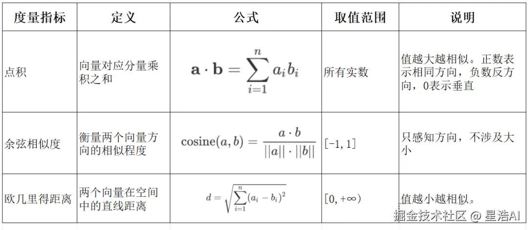 通过余弦相似度、欧氏距离等度量向量关联性,支撑检索增强生成(RAG)、推荐系统等应用。