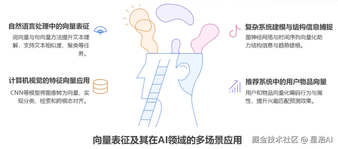 向量表征是人工智能领域的基础,通过将文本、图像、声音等复杂信息转化为高维向量(Embedding),为机器学习模型提供统一的数学描述方式,实现语义理解与处理。