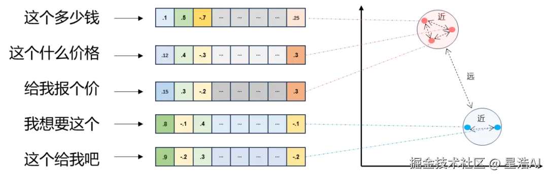 向量空间中的距离(如余弦相似度)反映对象之间的语义关联(如"猫"和"狗"的向量距离小于"猫"和"汽车")。