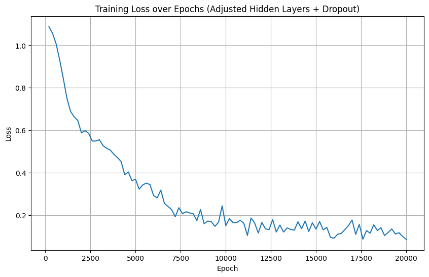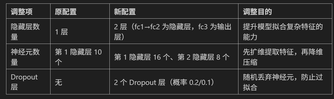 调整后的模型牺牲了训练效率与训练损失的 "平滑性",但通过增加复杂度(隐藏层 / 神经元)提升了拟合能力,同时通过 Dropout 降低了过拟合风险 ------ 是 "以训练成本换泛化能力" 的合理调整。