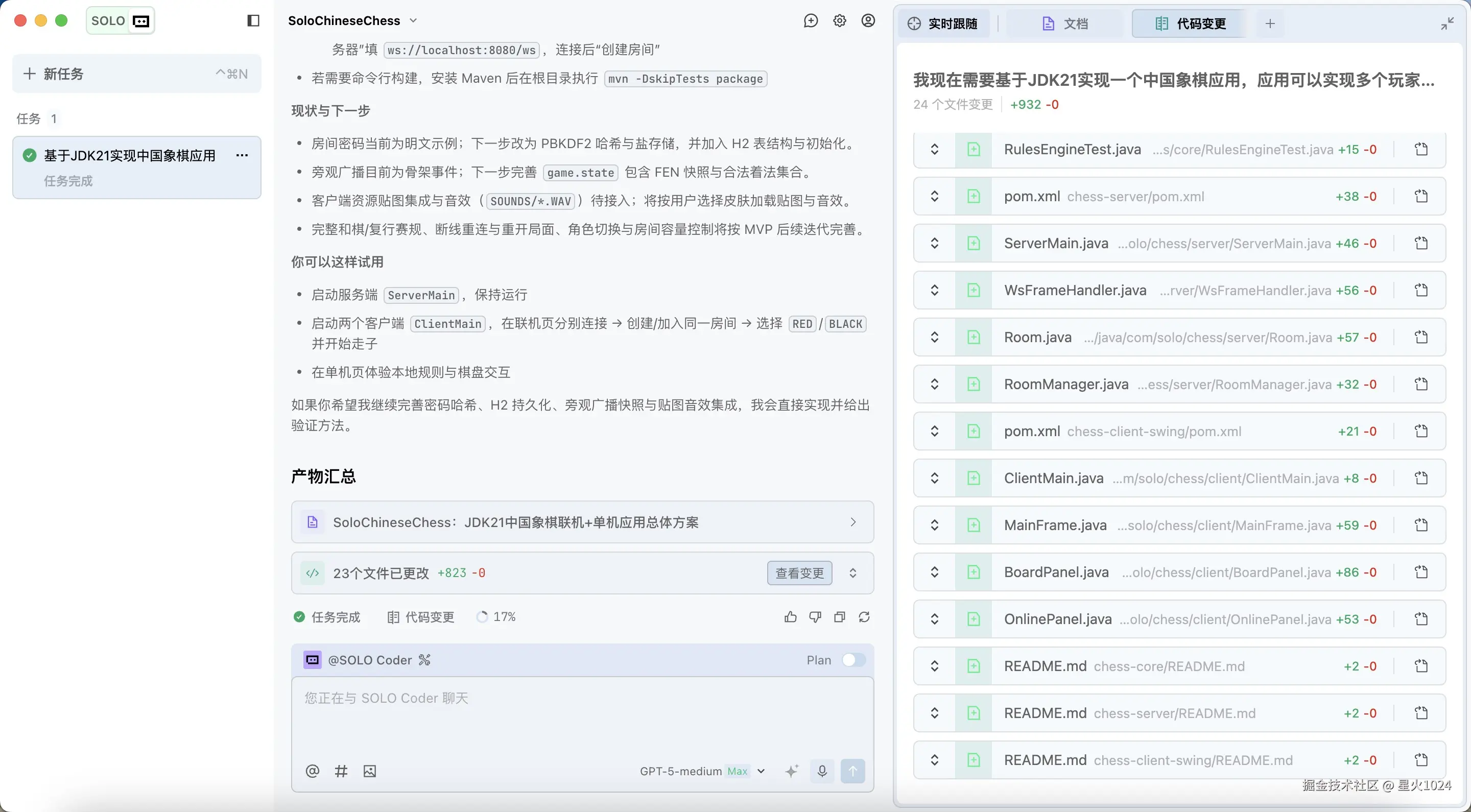 接下来是游戏规则,车直线、马走日、跑翻山......尝试了几步,规则实现非常精准,先后手也非常的精确。大模型仅用 11 个 Java 类就完美落地。此项我觉得可以给满分。