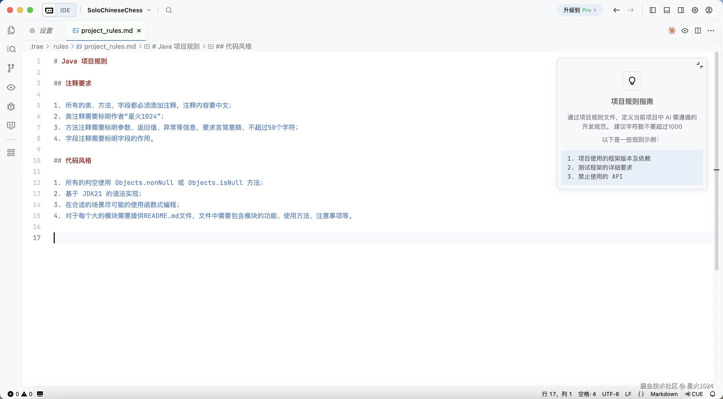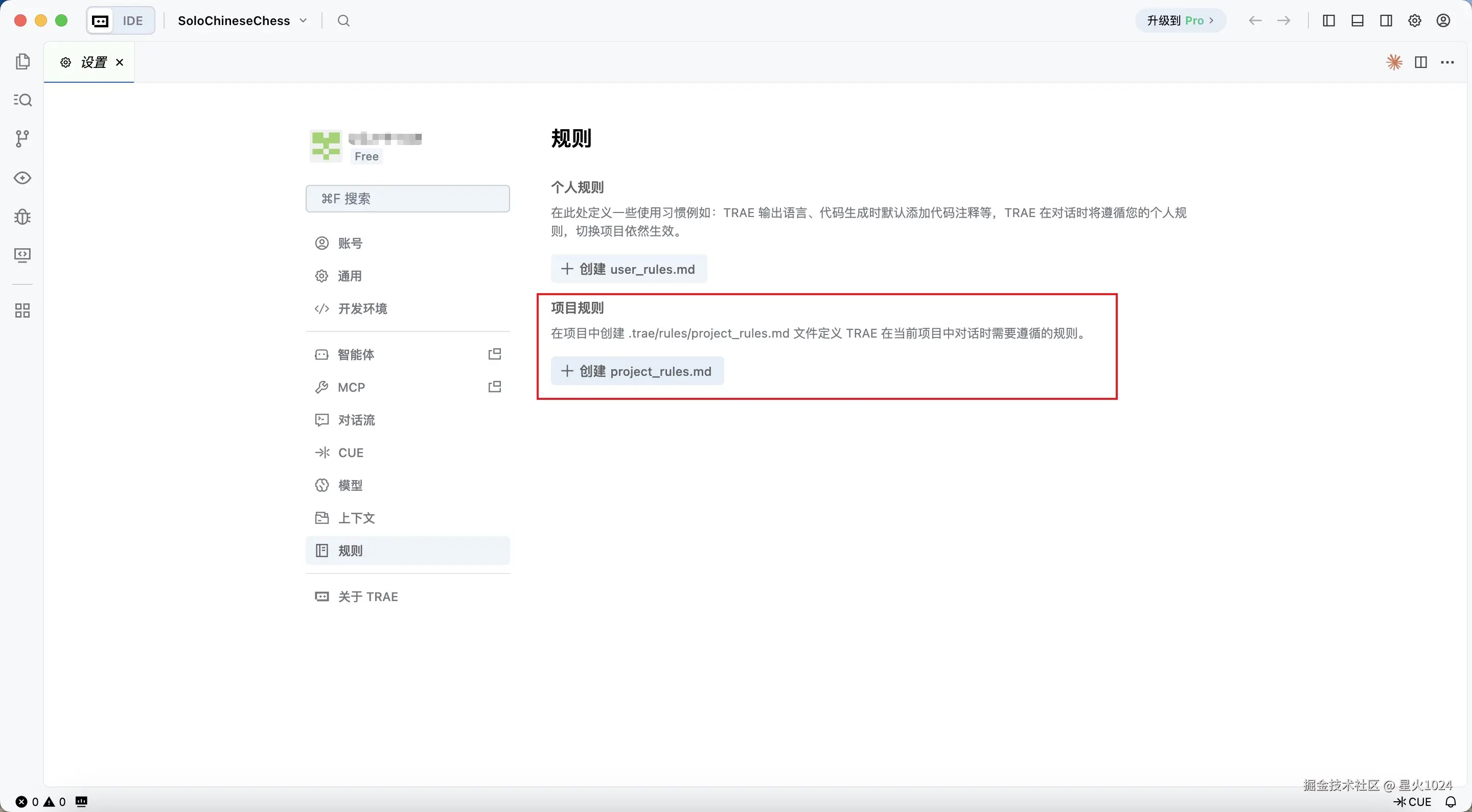 首先,我在"设置"-"规则"中配置一个 project_rules.md ,用于约束项目的编码风格和要求。