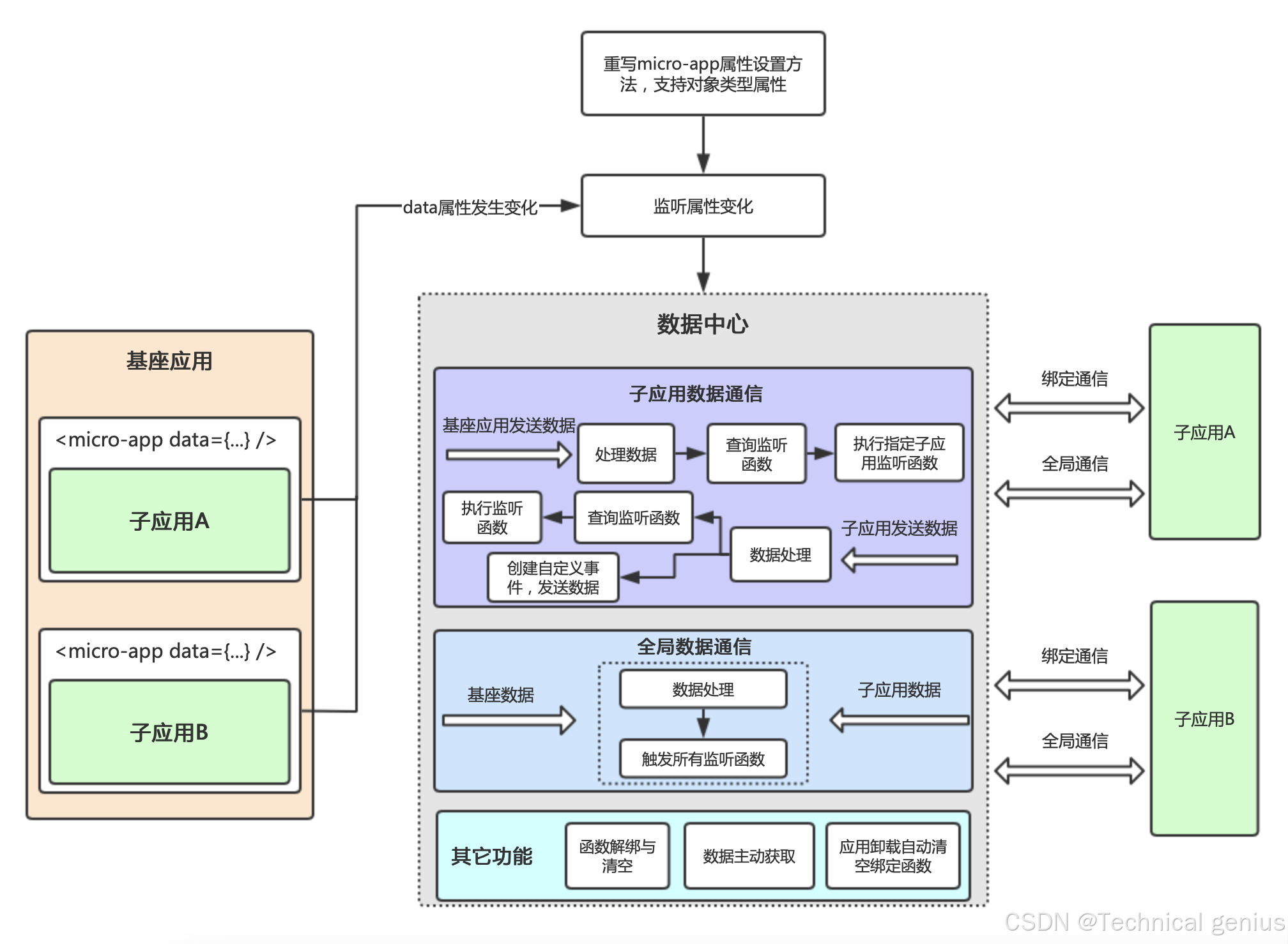 - 状态共享:通过Redux/Vuex或自定义全局状态管理数据流。