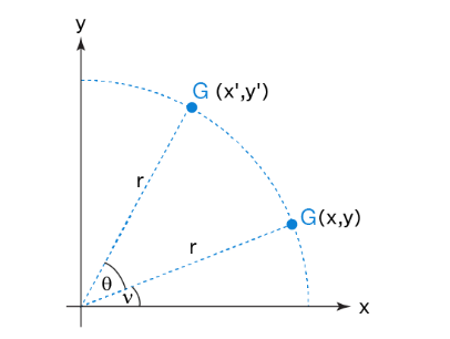 假设我们在二维空间(用笛卡尔坐标系统表示)中有一个点 ( x , y ), 则连接原点与 ( x , y )点的向量表示为 ( x , y ) ,设这个向量与 x 轴的夹角为 ν ,现在我们将这个向量按逆时针方向旋转角度 θ ,得到新的坐标 ,如下图:
