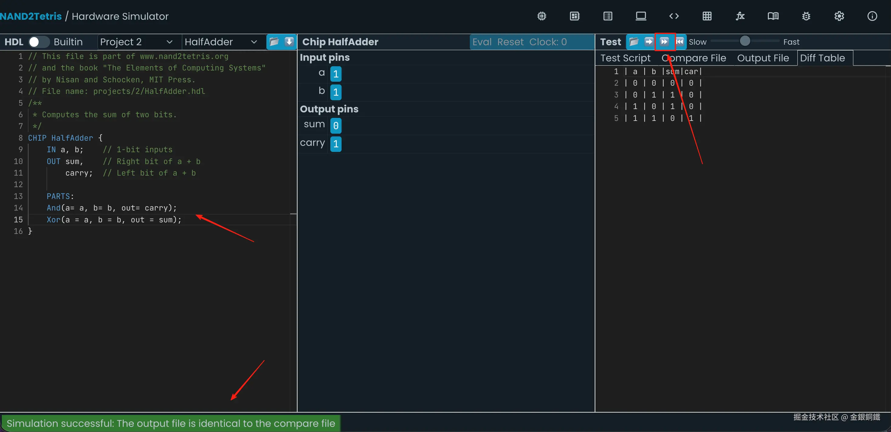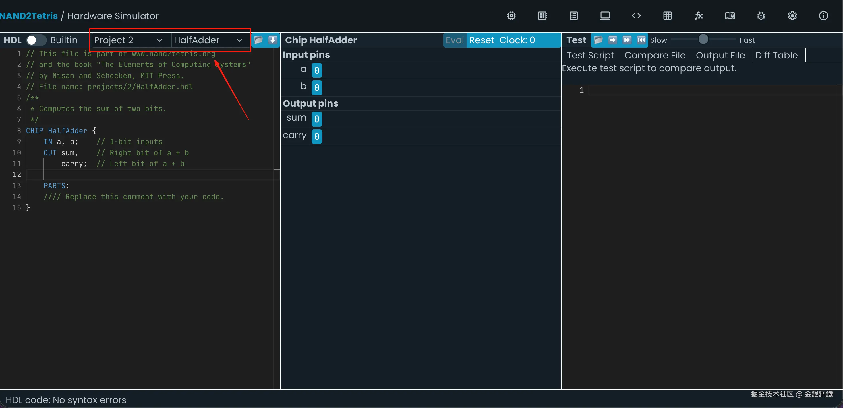前往 Nand to Tetris Online IDE,选择 Project 2 里的 HalfAdder,效果如下图所示 ⬇️